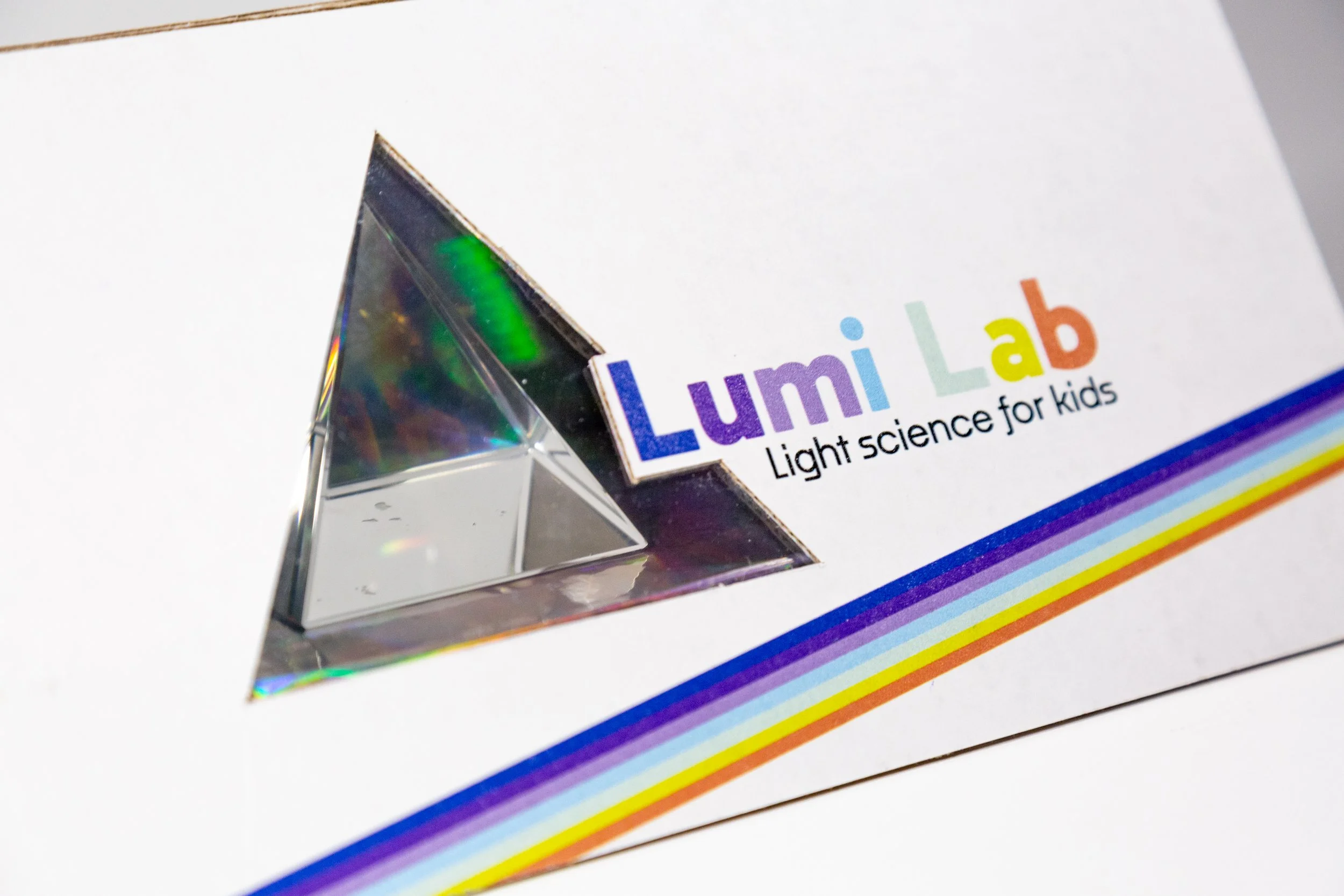 When designing the packaging, I set out to create a custom structure that was both visually compelling and conceptually tied to the content of the kit. Inspired by the crystal prisms included in Lumi Lab, I developed a custom triangular form based on a Toblerone box, designing the dieline from scratch to ensure the components fit precisely, create strong shelf differentiation, and conceptually reinforce the project’s focus on light and refraction. A pull-out drawer mechanism was incorporated to elevate the unboxing experience and support a more premium feel. The final package was professionally printed at Yellow Dog Print Shop in Denver.
